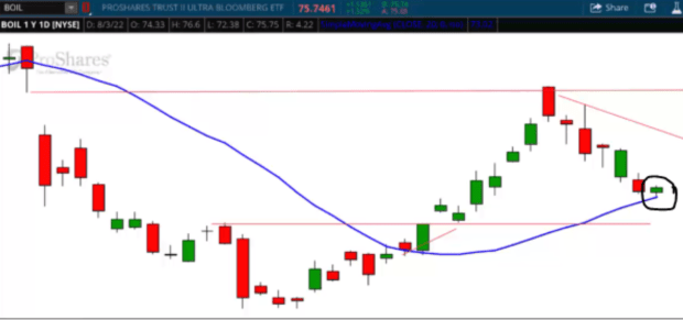 When AJ first set his eyes on BOIL, it was in a short-term downtrend. However, after taking a closer look, BOIL’s chart started to check off some of AJ’s technical analysis boxes. AJ first called out the spinning top (circled in black) at the bottom of the 6-day downtrend. Recall that single-candle patterns like this spinning top at the bottom of a downtrend indicate investor indecision and possible trend reversal. That spinning top occurred directly on top of the 20-day simple moving average (the blue line), and just above a nearby flat line (the lower red line).