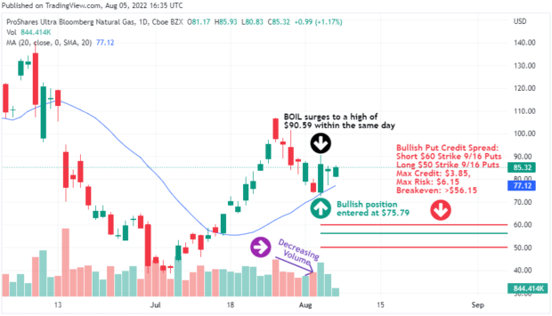But even though his trade expiration was more than a month out, it didn’t take anywhere near that long for this trade idea to work. AJ entered the trade early on August 3rd, with BOIL trading at $75.79. Before the end of the day, BOIL surged more than 19% to trade as high as $90.59.
