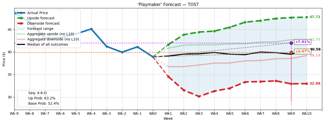 For instance, in week 9 — which matches the Nov. 21 options chain — the exceedance probability is about 55%, targeting a TOST stock price of $39.48. However, the average of the forecasted conditional pathways associated with the 4-6-D sequence lands at $40.29. Therefore, speculators are mathematically incentivized to take a more aggressive bet as the sequence is signaling a greater magnitude of success relative to what would normally be expected.