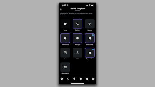 - Select your favorite Twitter destinations to pin them to your toolbar. The “Home” button cannot be removed. You can choose as few as two or a maximum of six buttons to live on your toolbar. You can see a preview of how the buttons will look at the bottom of your screen. There’s no drag-and-drop feature to organize these buttons — to switch up the order you have to deselect everything and then add them again in your preferred order.