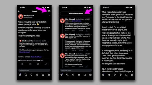 - When you tap on a thread of tweets, you can turn on Reader mode by tapping the Reader icon in the top right-hand corner of your screen or tapping the “View thread in Reader” button below the first tweet in the thread.