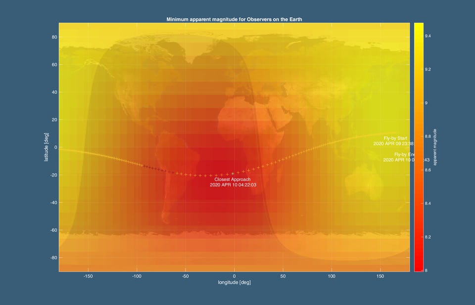 It will be closest to Earth at 12:24 a.m. Eastern on April 10. At that point, it will be visible to us Earthlings through a small telescope or even a set of binoculars.