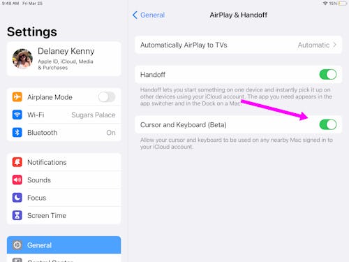 - Tap “General” on the left-hand sidebar, then tap “AirPlay & Handoff.”