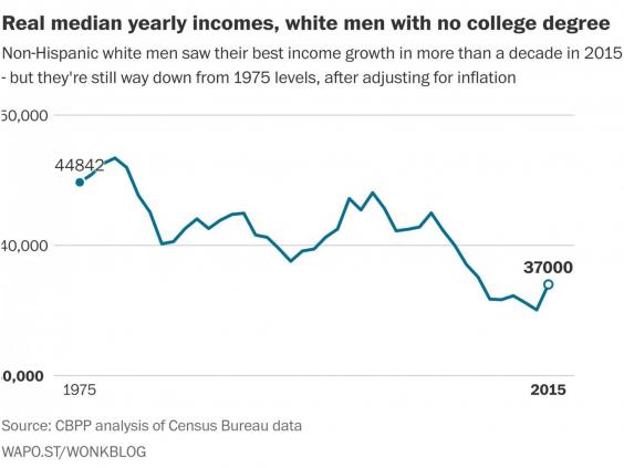 For the past 40 years, America's economy has raked blue-collar white men over the coals. It whittled their paychecks. It devalued the type of work they did best. It shuttered factories and mines and shops in their communities. New industries sprouted in cities where they didn't live, powered by workers with college degrees they didn't hold.