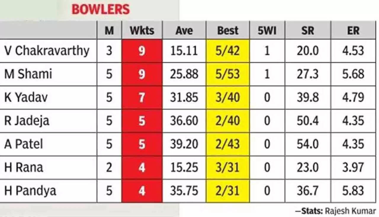 Surely, India's Most Valuable Player of the tournament. Introduced after the first two matches, Varun's 'mystery spin' spun a web around the opposition batters and was instrumental in India's success. Along with Shami and Santner, he was the tournament's joint second highest wicket-taker, claiming nine wickets in just three matches. His unique spin variations, including carrom balls, flippers, googlies, leg-spin, arm ball etc. posed significant challenges for opponents. His standout performance included a maiden five-wicket haul against New Zealand in the group stage.