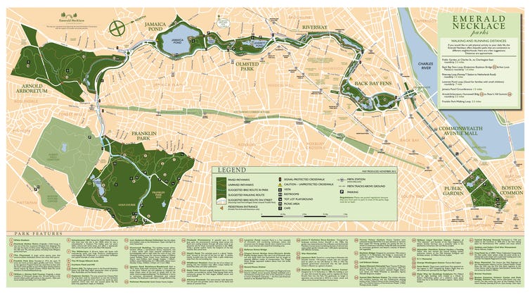 The insights Olmsted gained into connections between space, disease control, and public health clearly influenced his landscape architectural career and the design of many urban park systems. For example, his design for the interlinked parks that forms Boston’s Emerald Necklace foreshadowed the concept of green infrastructure.
