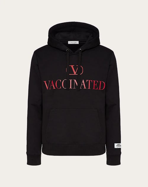 Piccioli spoke to the New York Times about the progression of Cloney’s “Vaccinated” hoodie and said, “I didn’t want to steal the idea — even though I wished I had it first.” Instead, he was able to get Cloney founder Duke Christian George III to agree to “donate” the idea.” In exchange, Valentino would produce the hoodies in its own factories to align with the brand’s quality standards and donate all the proceeds earned, a figure estimated to reach at least $900,000. (A “Cloney” tag is also stitched onto the hoodie’s left sleeve.)