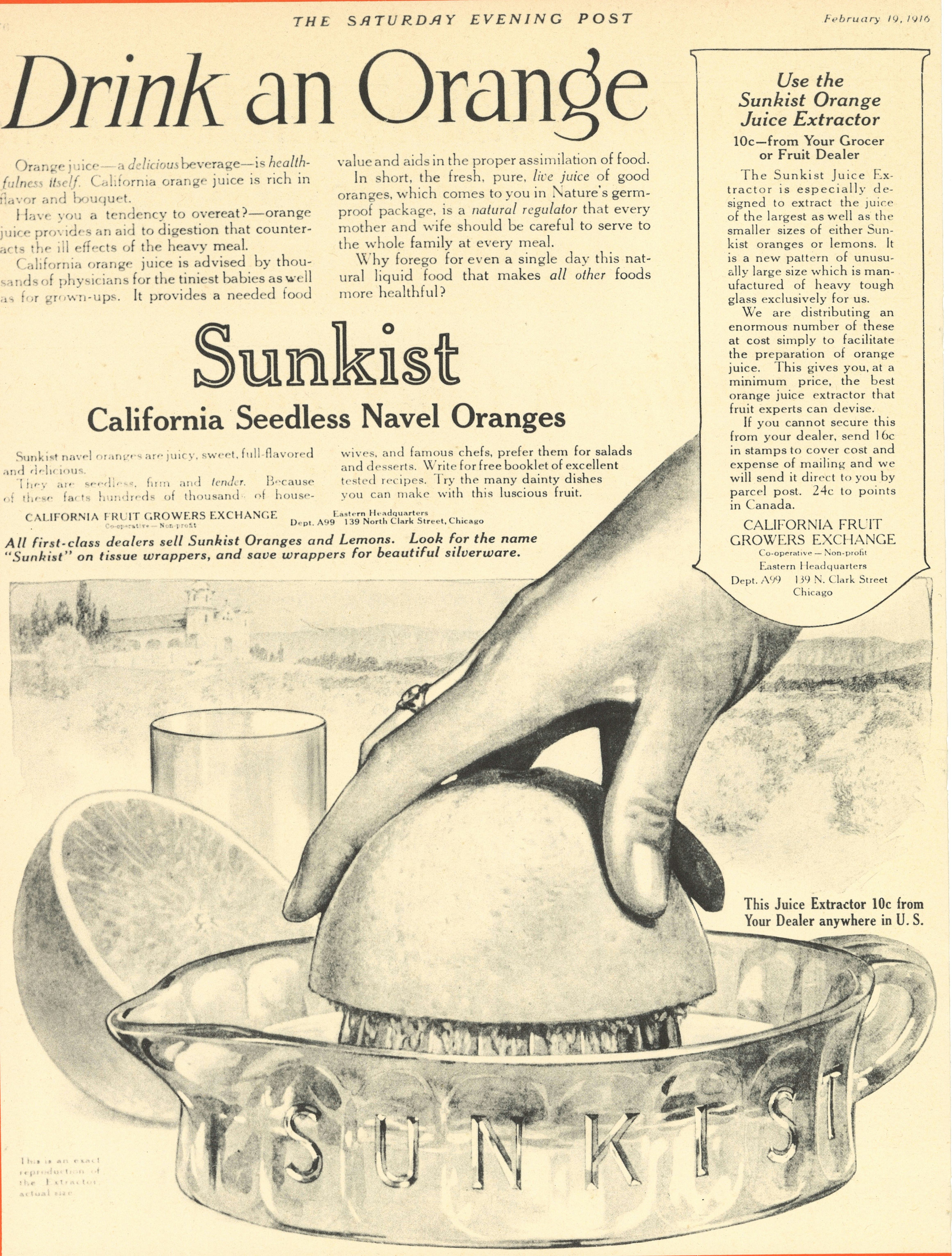 In the early 1900s, Sivulka said, the Southern California Fruit Growers Association (which later became the popular orange brand Sunkist) was searching for a way to sell more fruit. Marketers hired by the company understood that consumers typically ate oranges. To increase the number of oranges sold, Claude Hopkins of the ad agency Lord & Thomas introduced a campaign called “Drink an Orange,” said Sivulka.