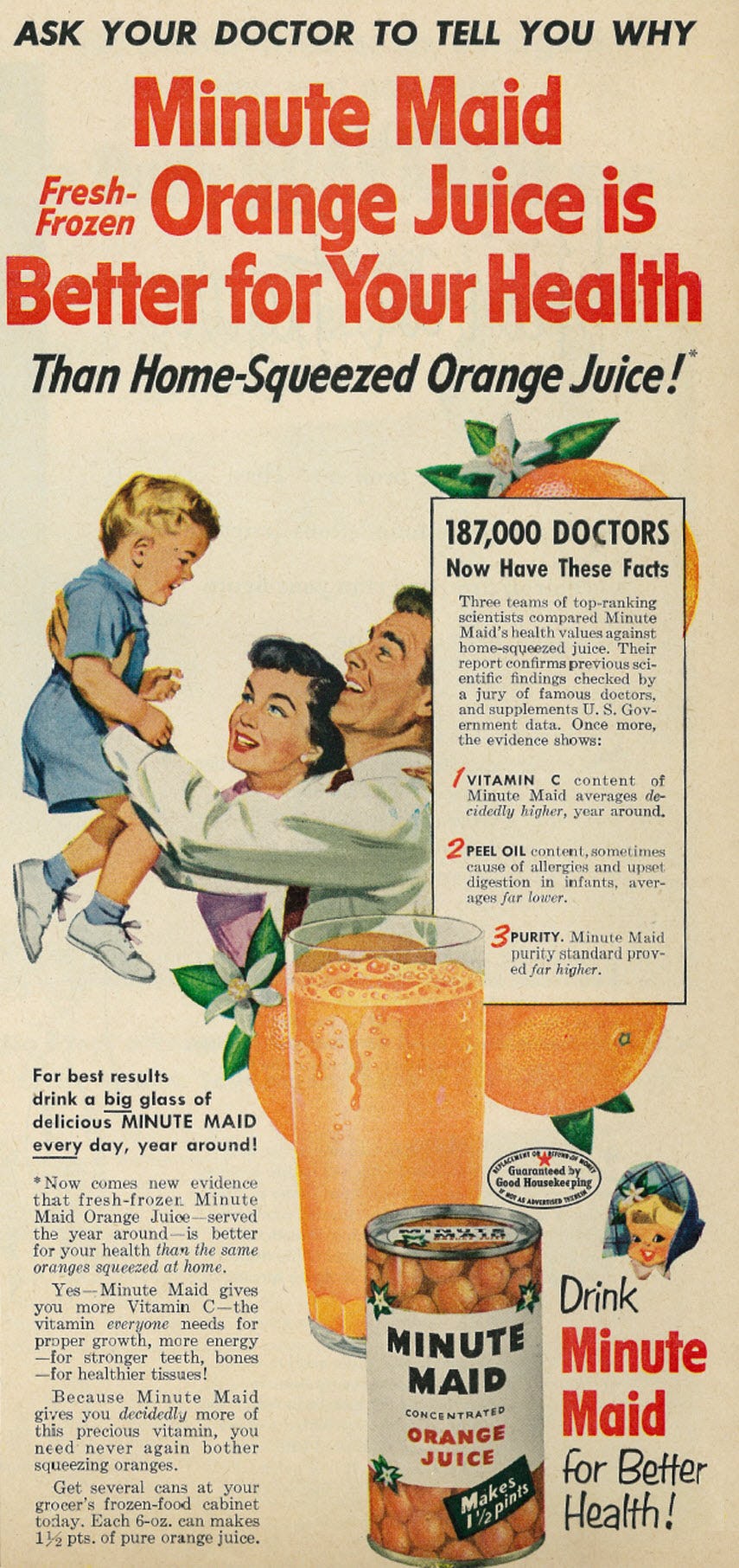 That the false notion of OJ curing the common cold has survived for nearly 100 years teaches us one thing: The power of marketing is lasting and strong. Since Sunkist set the foundation, several other brands have piggybacked off its strategy: A 1952 Minute Maid advertisement, for example, told consumers to “drink Minute Maid for better health” and claimed frozen OJ was more healthful than home-squeezed versions (sounds fishy, no?).