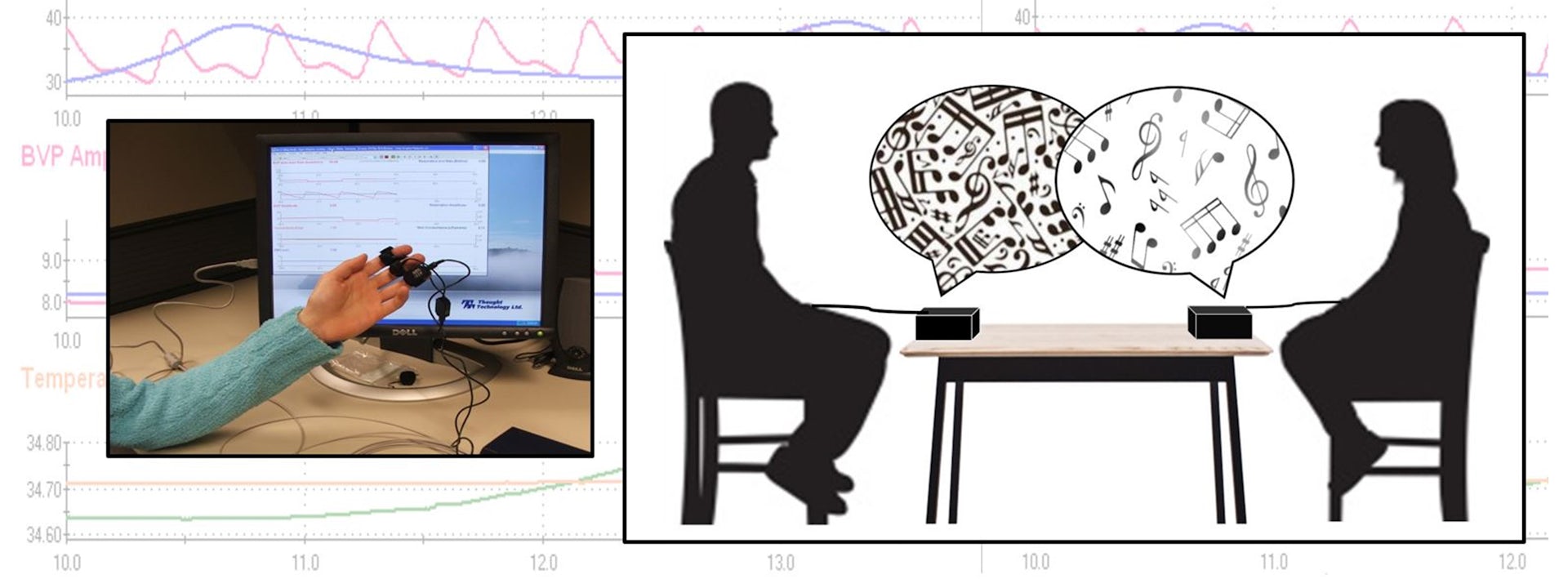 The technology collects autonomic nervous system signals — such as the amount of sweat in the skin and heart rate — through a wearable sensor. It maps features of these signals to sounds, generated and synthesized in real time.