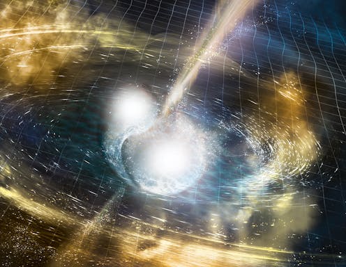 But GW170817 – the catchy title for the event of August 17 — changes all that. That’s because the source of the waves this time was two “neutron stars” – incredibly dense stellar remnants the size of a city, each weighing more than the sun. These stars whizzed around each other at a sizeable fraction of the speed of light before merging in a cataclysmic collision that we’ve now seen shake the very fabric of space and time.