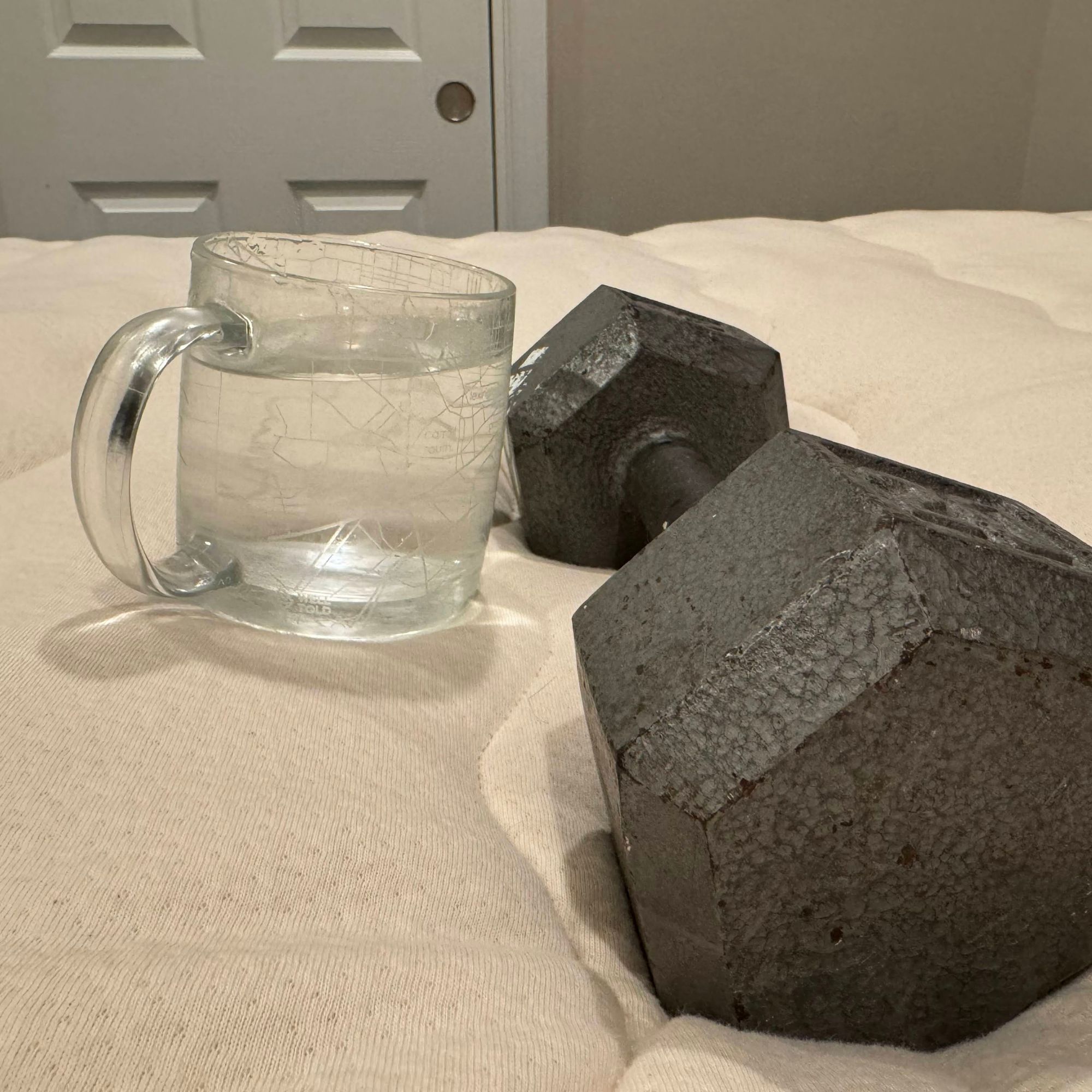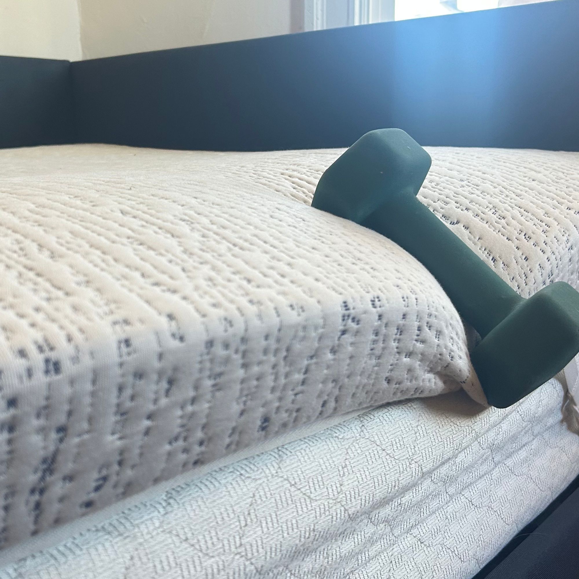 We might use the same weight-and-water-glass combination from the motion isolation test to reinforce our findings, moving them to the edge of the mattress topper and measuring how much, if any, water spills.