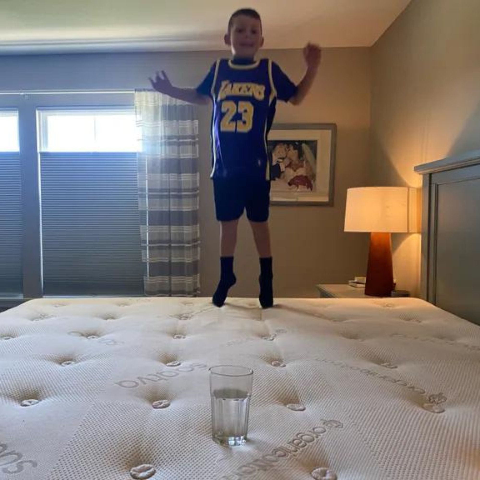 This is where it starts to get interesting. To test the motion isolation of a mattress, we fill a glass with water and set it in the center of the bed. Then, we apply pressure around it. That could look like anything from jumping up and down around the glass (see above!) to tossing and turning on the bed beside it.