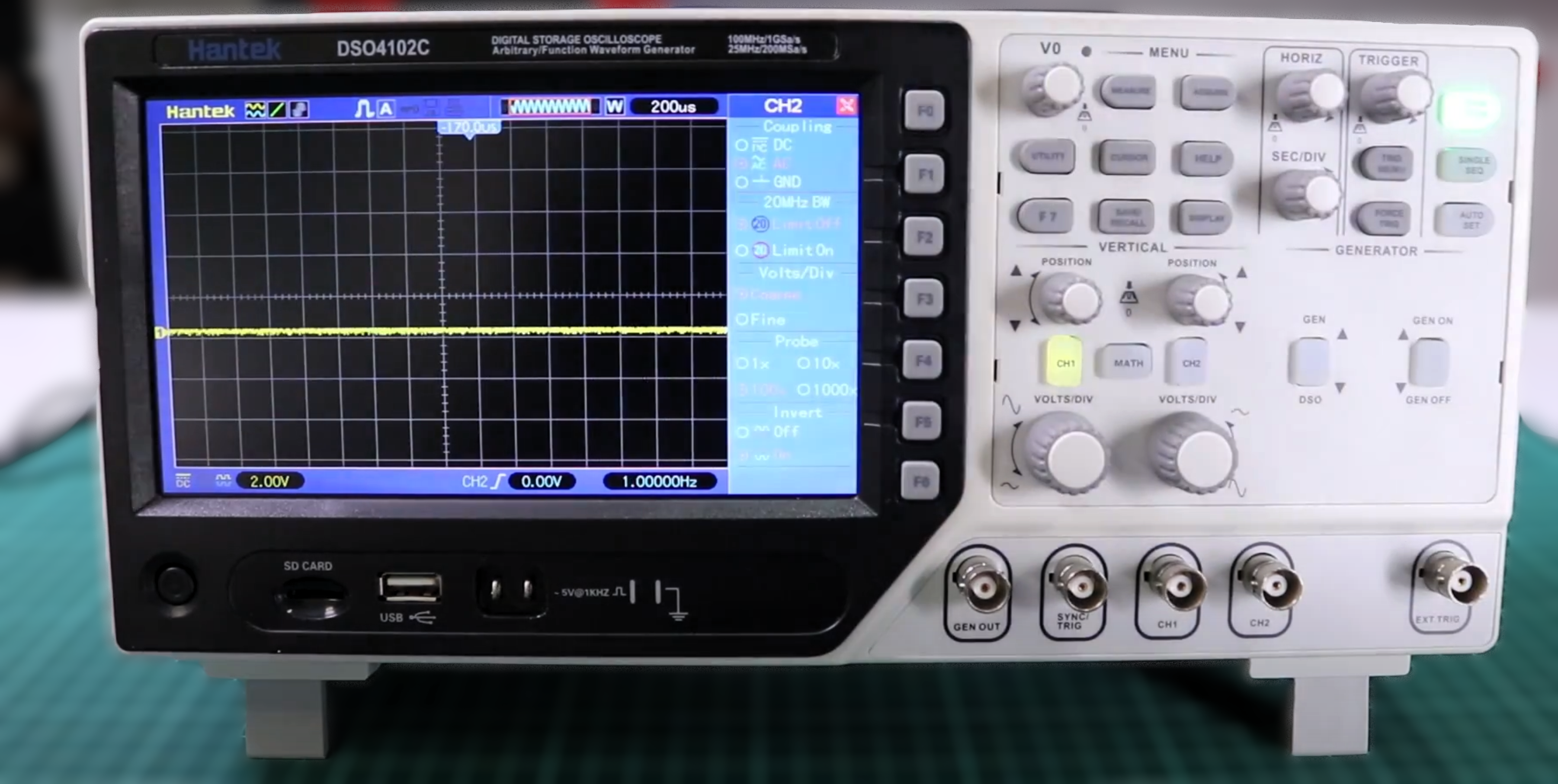 A Hantek DSO4102S is used, with a maximum bandwidth of 100 MHz and digital acquisition capabilities.
