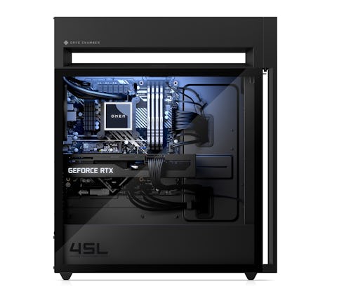 The Omen 45L is HP’s newest size in its Omen-branded gaming PCs and starts at $1,899.99. Besides being larger (up until this point the Omen 40L was HP’s largest), the 45L features a new cooling method HP is dubbing the “Omen Cryo Chamber.” The up-to-360mm AIO liquid cooler sits on top of the 45L case, pulling double duty as both a handle when you need to move the Omen 45L and a fan for pulling in cool ambient air from the outside into the computer case. HP claims the Omen Cryo Chamber “results in CPU temperatures six degrees Celsius lower at full load” than an identical model without the cooler.