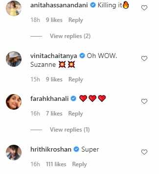 While her sister Farah Khan Ali dropped heart emoticons on the video, Anushka Ranjan wrote, ‘I did the sameeee workout yesterday.’ Hrithik too couldn’t help but praise his ex-wife. He commented on the video by saying, ‘Super’.