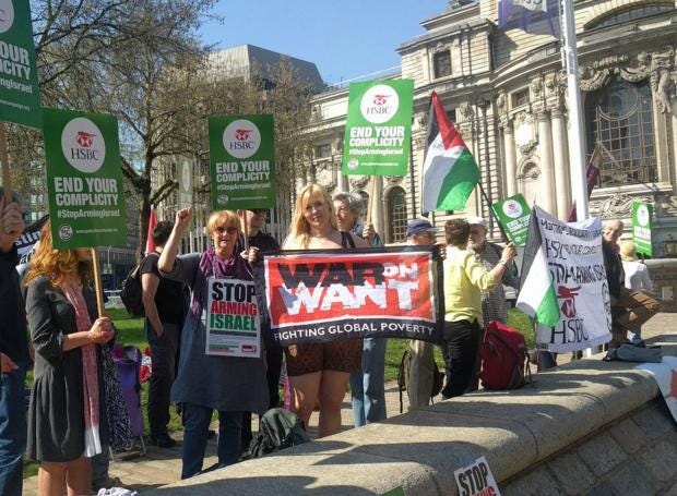 Ryvka Barnard, senior campaigner on militarism and security at War on Want, said: “HSBC holds millions of pounds worth of shares in companies like BAE Systems, Boeing, and Elbit Systems, whose weapons are used in Israeli military attacks on Palestinian civilians.