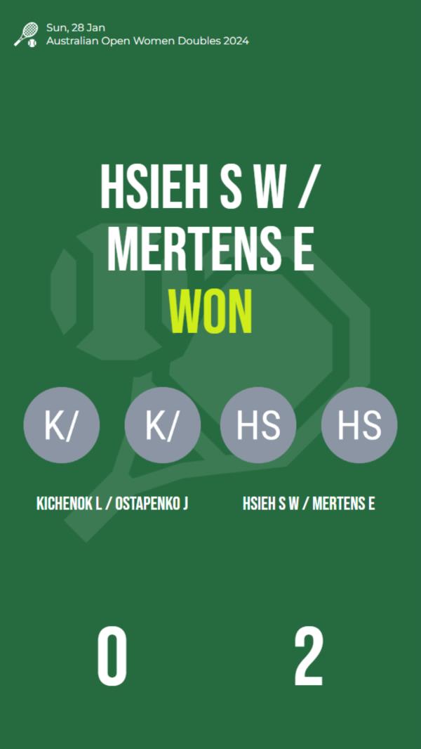 In conclusion, the final match of the Australian Open Women Doubles 2024 was a showcase of exceptional talent and determination. Hsieh S W / Mertens E emerged as the worthy winners, demonstrating superior strategy, resilience, and an unrivaled ability to convert break points. It was a match that will surely be remembered as a display of athletic excellence in the world of women's doubles tennis.