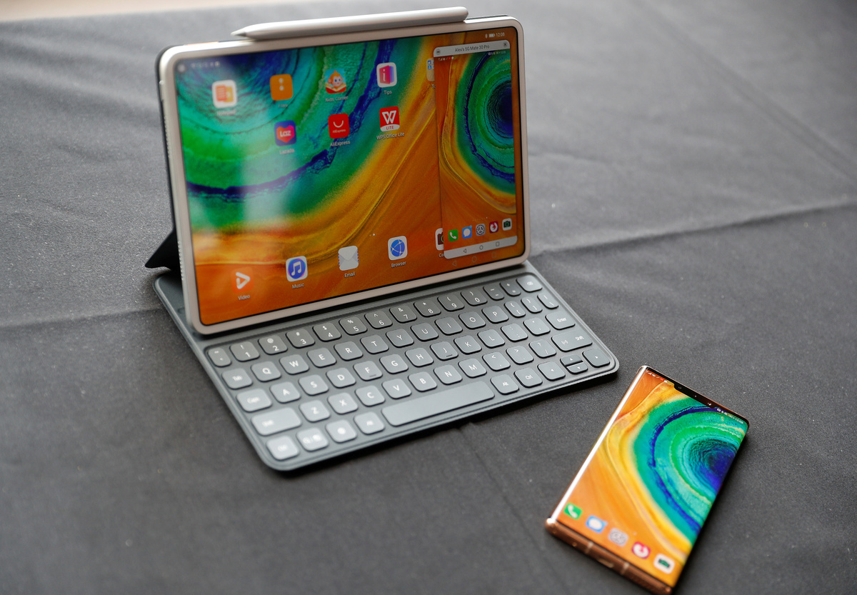 A Huawei MatePad Pro (L) is seen connected to a Mate Pro 30 device, during a media event in London, Britain, February 18, 2020. Picture taken February 18, 2020. REUTERS/Peter Nicholls