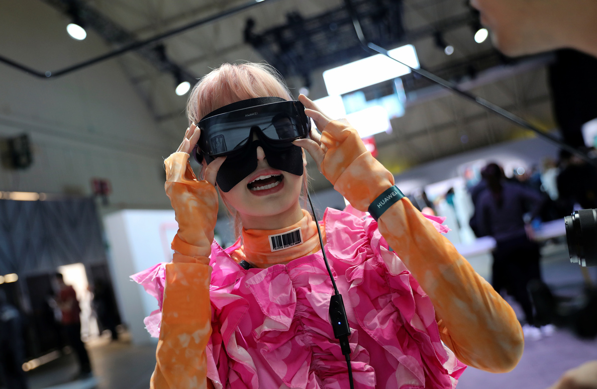 A woman wears VR glasses during Huawei product launch event in Barcelona, Spain February 24, 2020. REUTERS/Nacho Doce