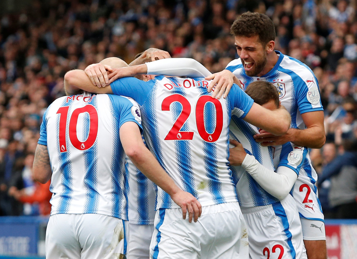 Soccer Football - Premier League - Huddersfield Town vs Manchester United - John Smith's Stadium, Huddersfield, Britain - October 21, 2017 Huddersfield Town’s Jonas Lossl, Laurent Depoitre, Steve Mounie, Christopher Schindler and Mathias Jorgensen celebrate in front of the fans at the end of the match Action Images via Reuters/Ed Sykes