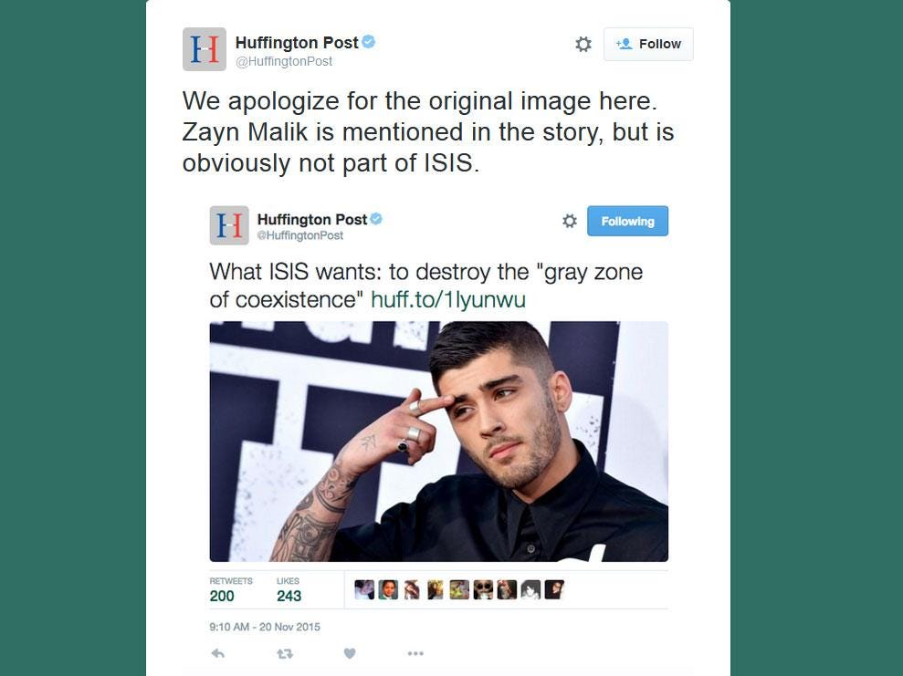 Alongside the apology was a clarification that Malik is “obviously not part of Isis” along with a picture of their original mistake.