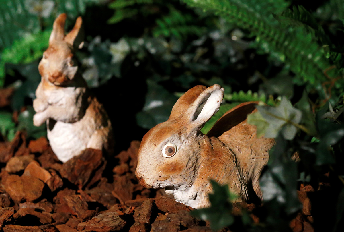 Chocolate sculptures of rabbits are seen during the chocolate sculpture festival in Durbuy, Belgium March 29, 2018. REUTERS/Francois Lenoir