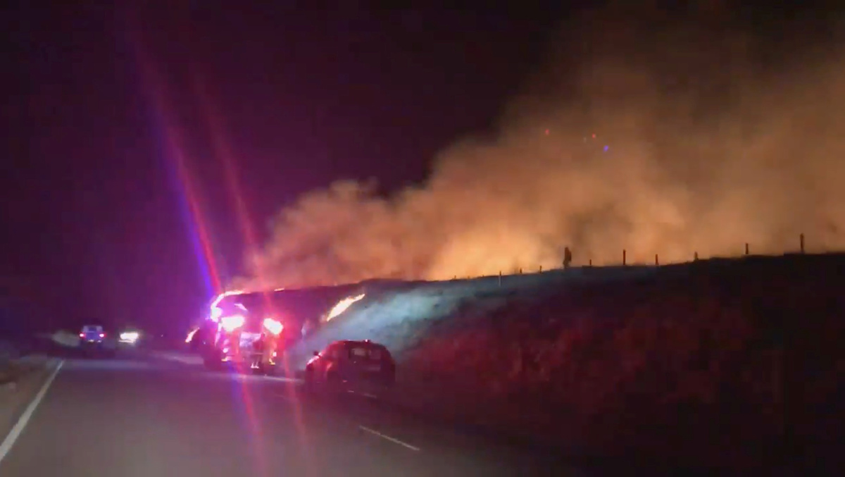 Emergency vehicles at the scene of a raging fire in Standedge in Oldham, England, February 26, 2019,in this still image taken from a video from social media. J Samantha Bentley via REUTERS