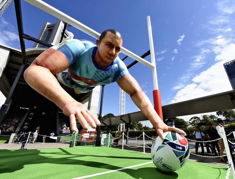 YOKOHAMA -- A 9-meter-long balloon depicting a rugby player grounding the ball for a try was inflated in Yokohama on Thursday, the day before the Rugby World Cup kicks off in Japan.