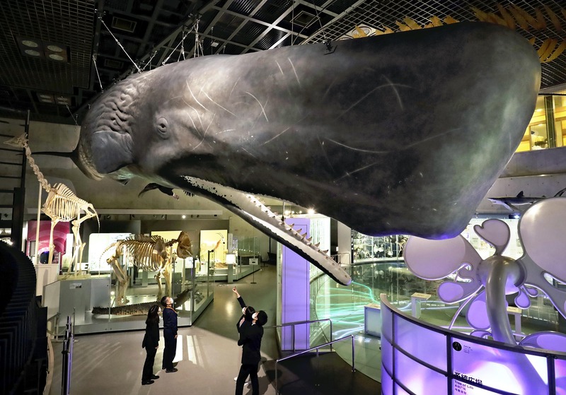 The National Museum of Nature and Science in Tokyo's Ueno district on Tuesday began a permanent display of the skeleton of a sperm whale, combined with a fleshed-out model of the right side of its body.
