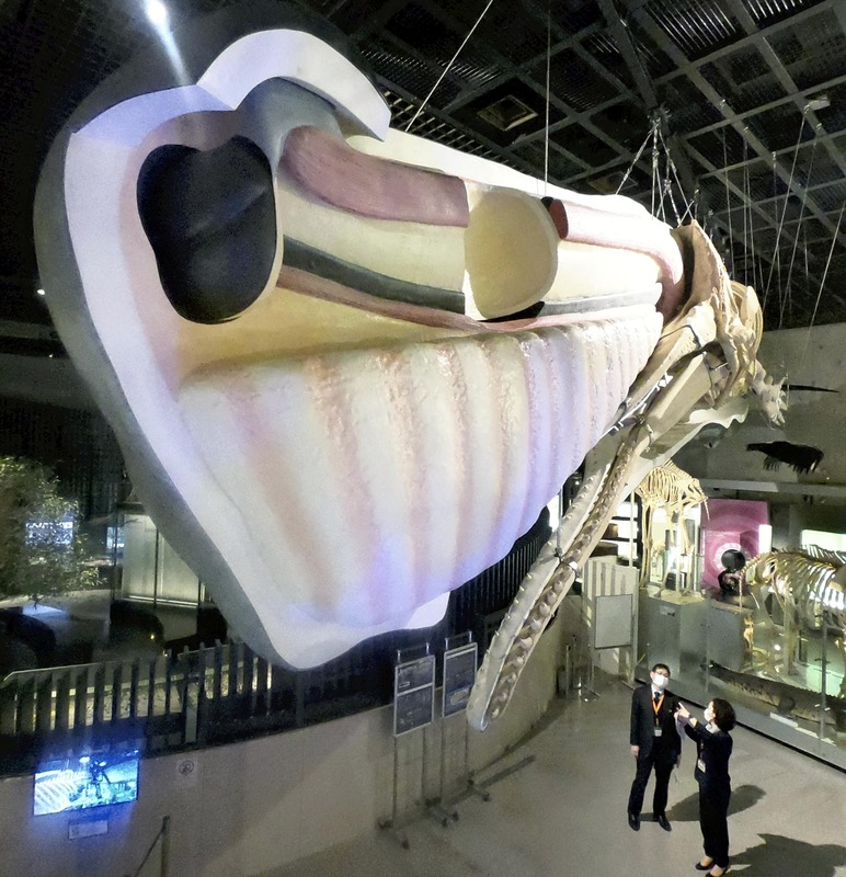 A press preview was held on Monday. According to the museum, the specimen was a 14-meter-long male that was washed up on a beach in Kagoshima Prefecture in 2005. The specimen can be seen suspended from the ceiling of the first floor at the museum's Global Gallery.