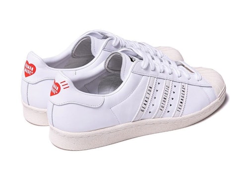 Between the stripes are two rows of perforated hearts, and Human Made's logo appears on the heel. Besides those cues, the collaboration keeps the Superstar as you know it: simple, tasteful, and eternally wearable. With two pairs coming in white — one with black stripes and mustache, the other all-white — it's an ideal summer sneaker with the element of hype. All three pairs, including the black and white, feature a cream shell toe for a nice sense of contrast.