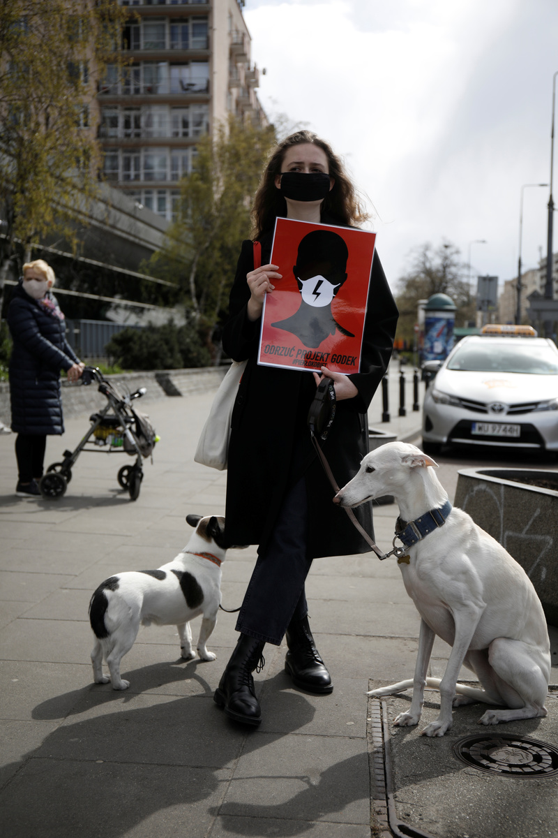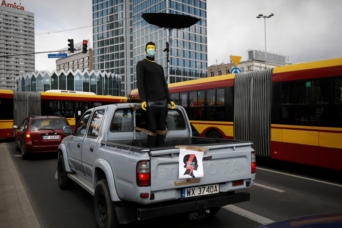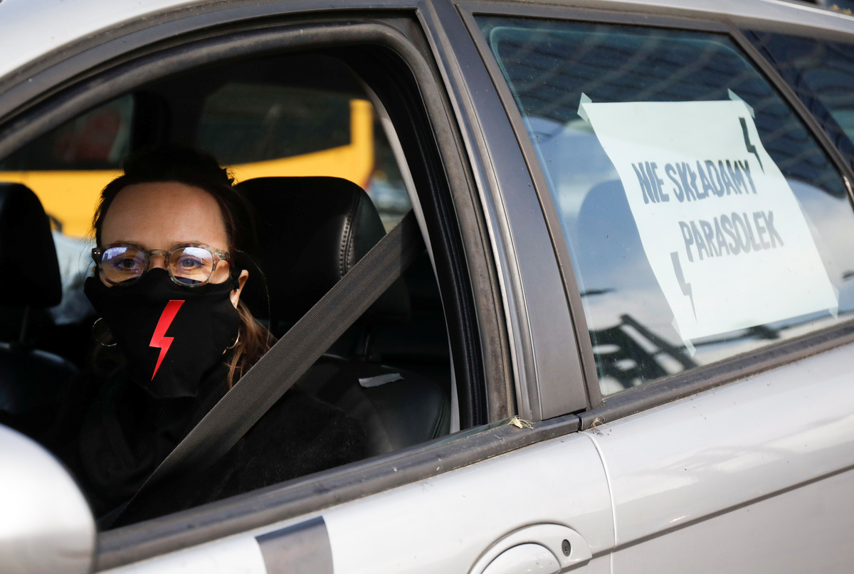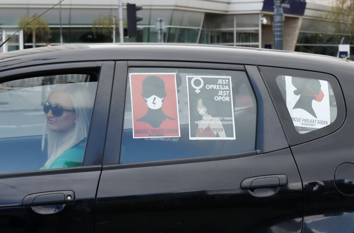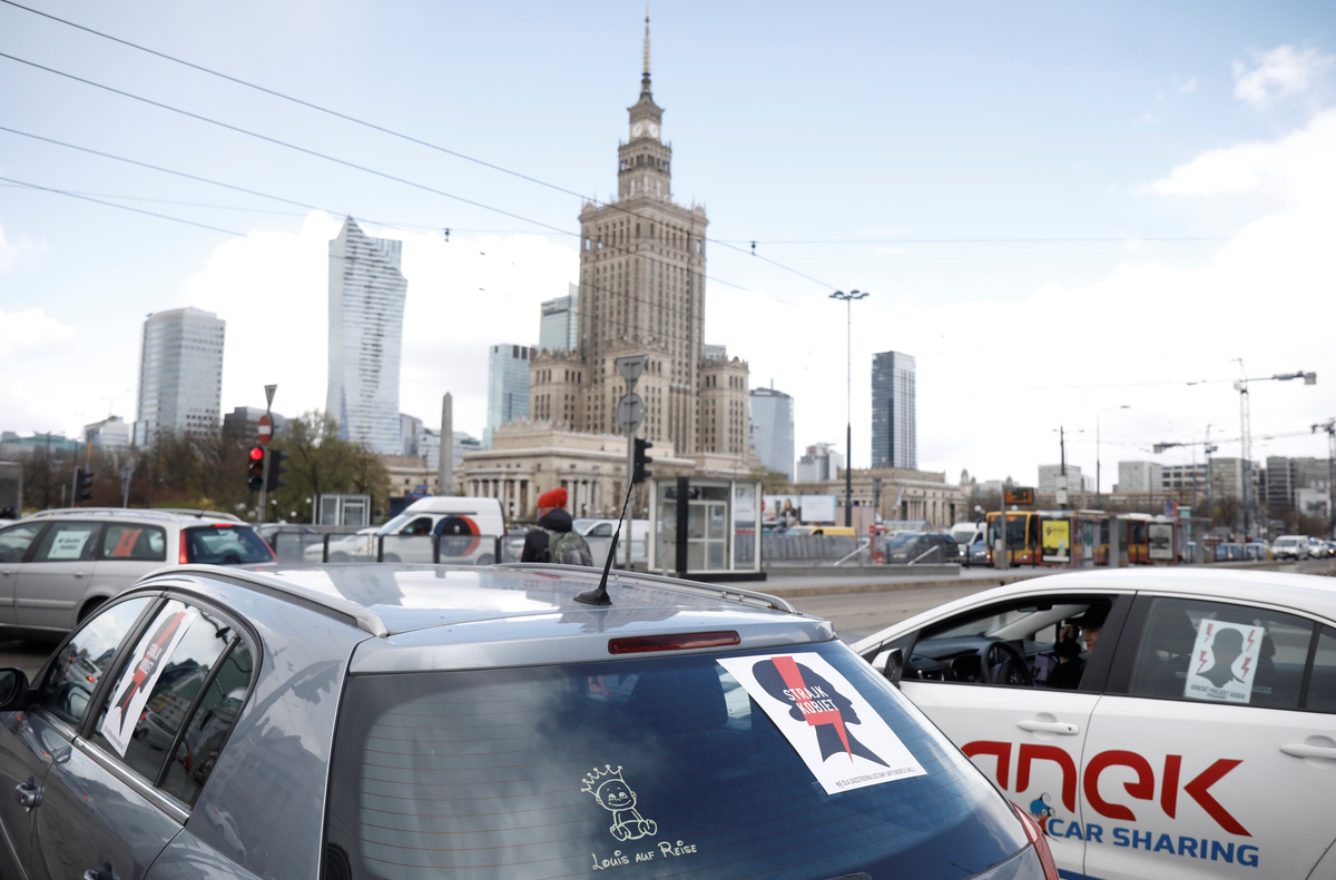 As restrictions on movement to contain the novel coronavirus prevented street gatherings, protesters driving in their cars blocked off one of Warsaw's main roundabouts, Rondo Dmowskiego.