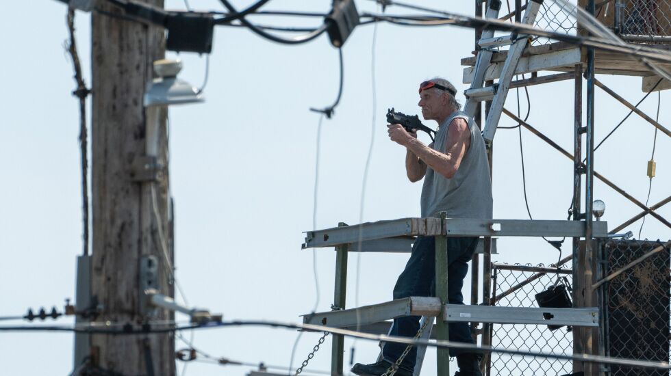 Neighbors said they reported seeing the man sitting on a makeshift platform atop the building, possibly with a gun, and had displayed an illuminated board with a swastika painted on it.