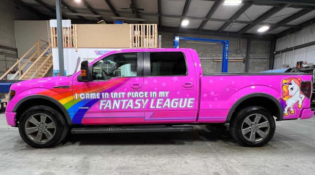While some leagues force losers to take the SAT or do a polar plunge, others have gotten a bit more creative. That’s how Kevin Ring ended up with a fluorescent pink Ford F150 that declares “I came in last place in my fantasy league” in giant white font and features unicorns, rainbows and stars.