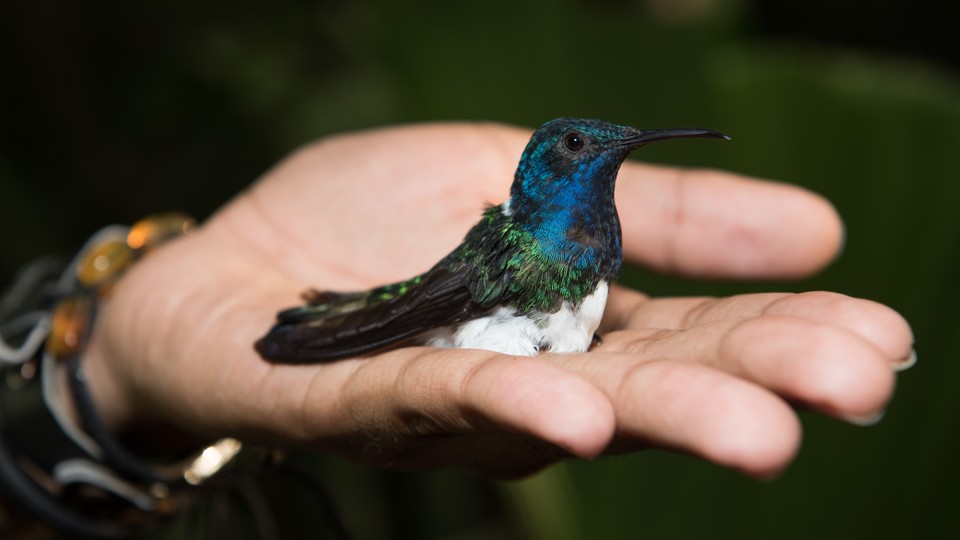In most birds, males are the showier sex: They’re the ones flashing their feathers, tussling for territory, and belting out serenades for their mates to assess. Females prefer their mates with glitz, but they have little reason to adorn themselves; gaudy feathers can make them more conspicuous to predators. “Ornamentation comes with risk,” Sarah Khalil, an ornithologist at Tulane University, told me. That white-necked jacobins, along with several other hummingbirds, buck this trend is “really odd,” Falk said. Only about a fifth of adult females manage the feat, but those that do are nearly indistinguishable from males, from the tops of their cerulean heads to the tips of their brilliant white tails. (Experts like Falk can differentiate the birds up close by inspecting very subtle traits or taking blood samples.)
