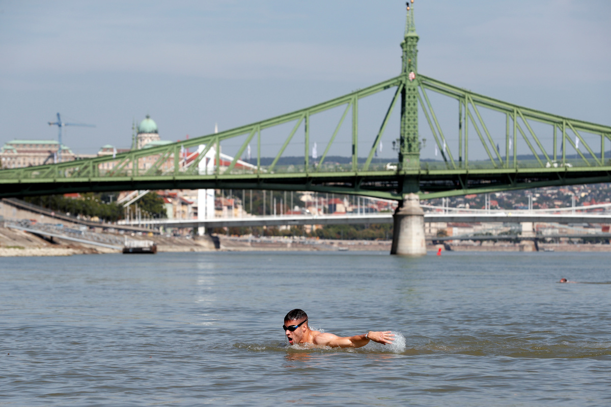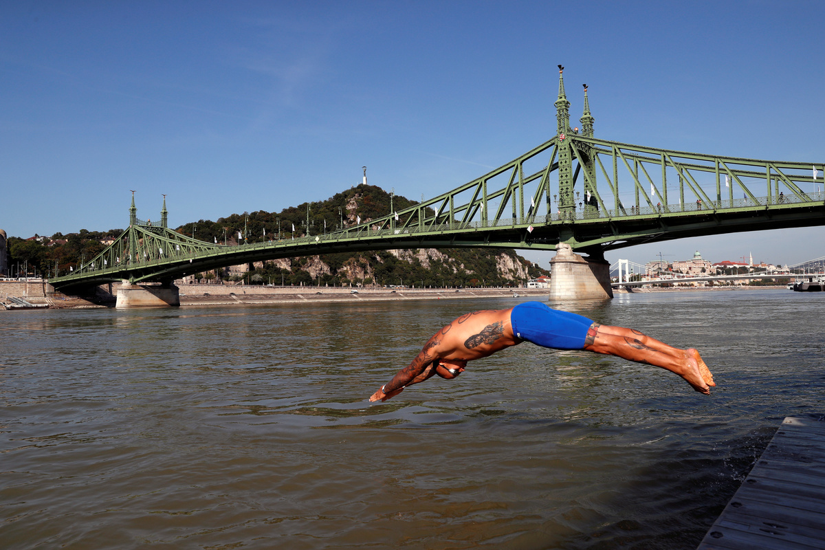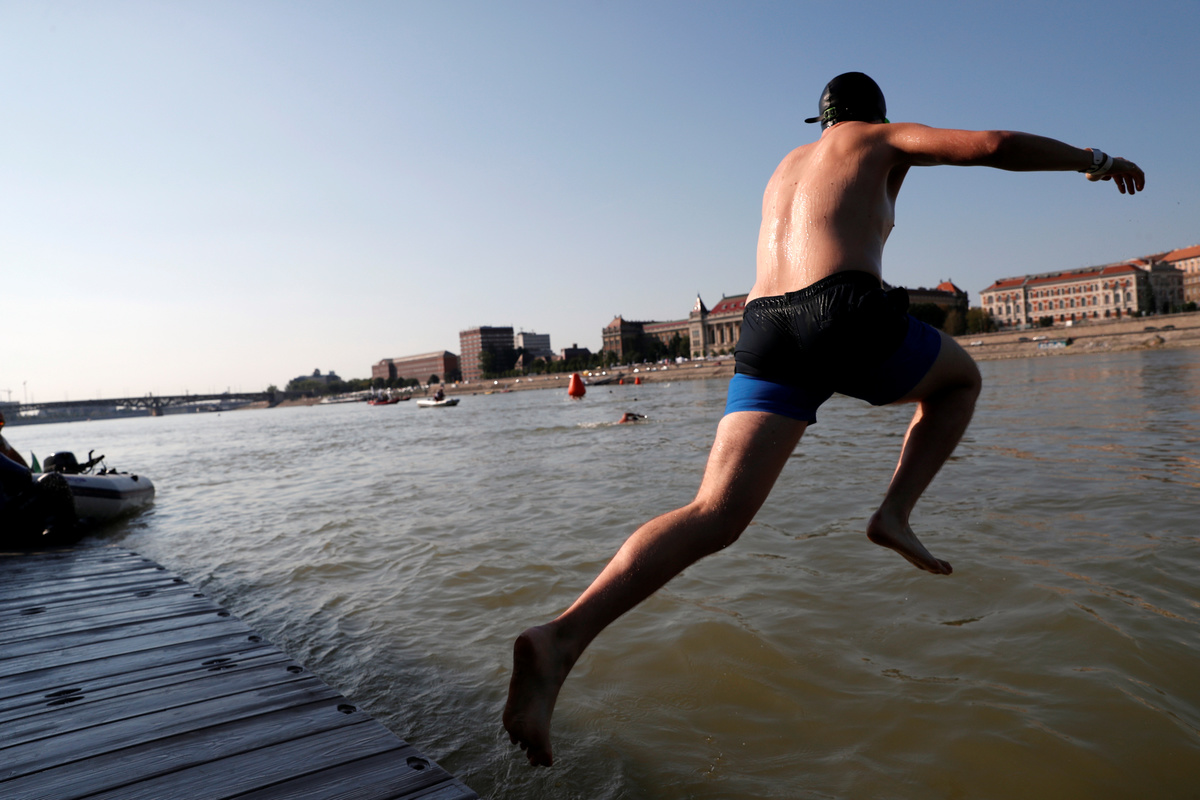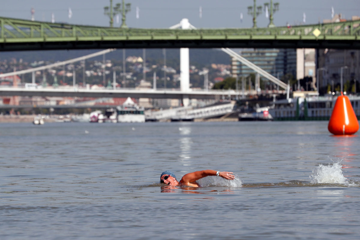 About 700 adventurous swimmers plunged into the fast-flowing waters of the Danube in Budapest on Saturday, enjoying an unusual view of the city's famous bridges as they swam across the longest river in the European Union.