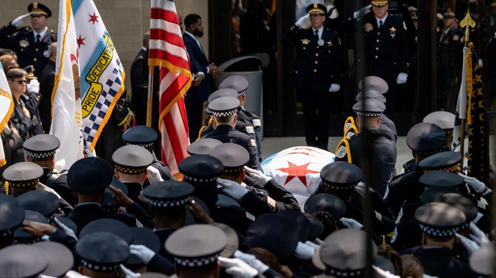 Former Mayor Lori Lightfoot, Mayor Brandon Johnson and interim Police Supt. Fred Waller were among the mourners who gathered outside the church as Preston’s white casket arrived in a hearse, draped in the city’s flag.