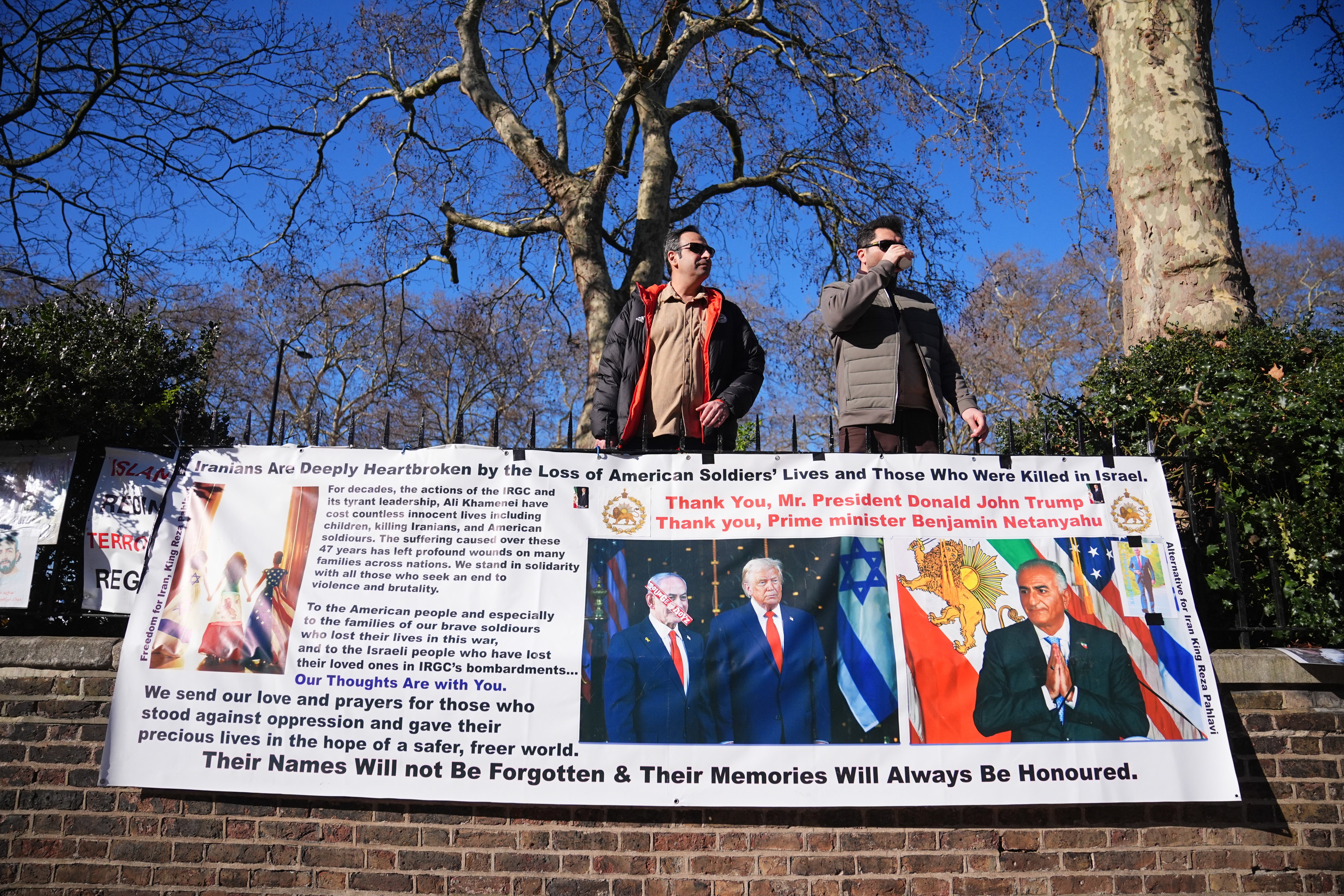 Later outside the Iranian embassy in Kensington, west London, Stage for Freedom protesters chanted beside a large sign that said: “Thank you, Mr President Donald John Trump. Thank you, Prime Minister Benjamin Netanyahu.”