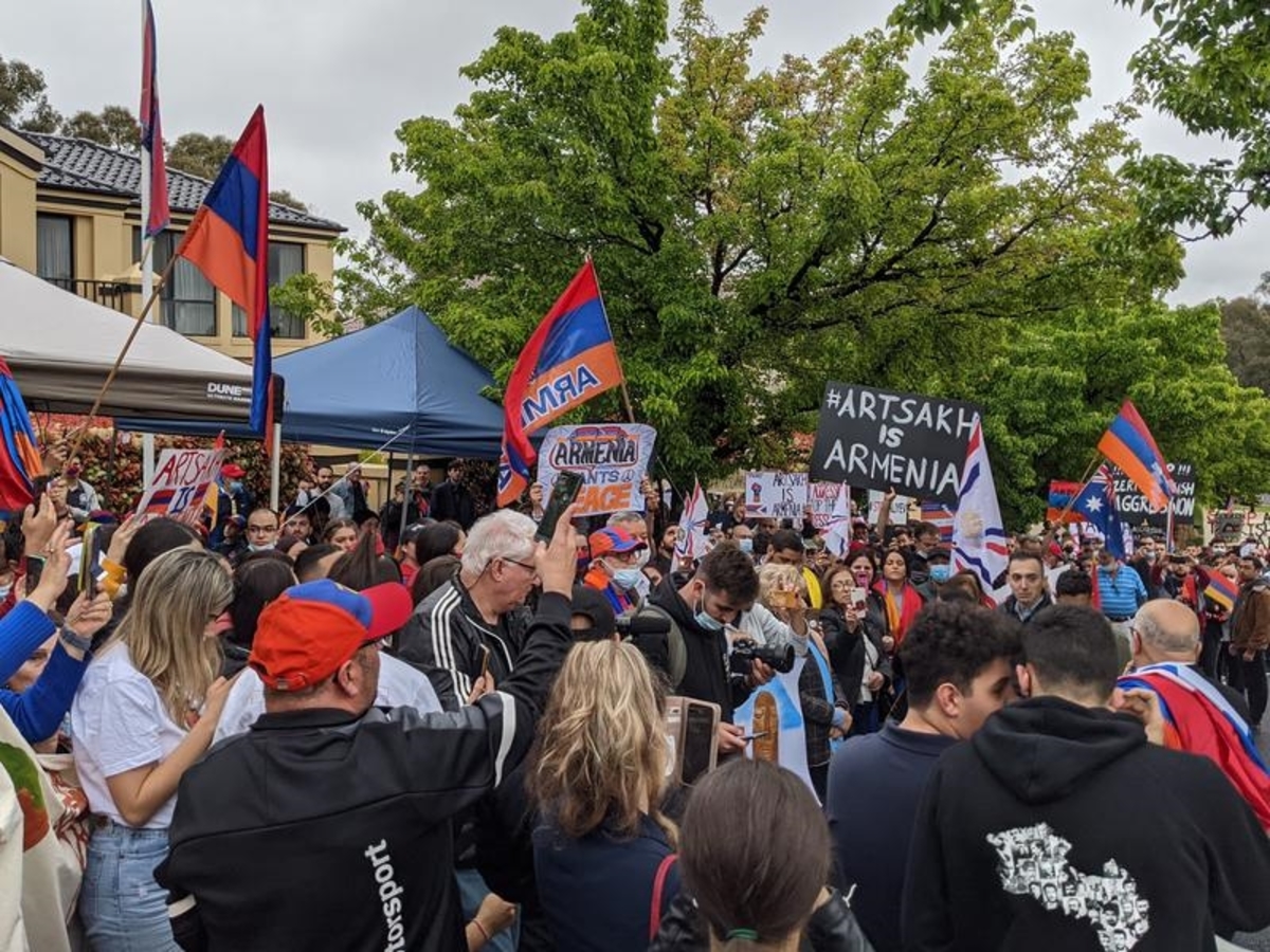 Hundreds of Australian Armenians have travelled to Canberra, calling on the government to speak out about attacks on an indigenous Armenian territory, they say amount to war crimes.