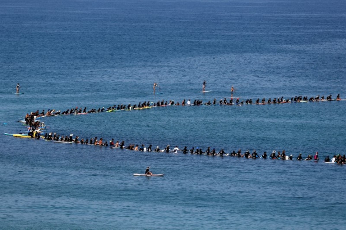 Organizers said 992 people, among them athletes and actors, paddled out and held hands to form a circle opposite Herzliya, promoting their demand that a planned gas rig be relocated further from Israel's Mediterranean coast.