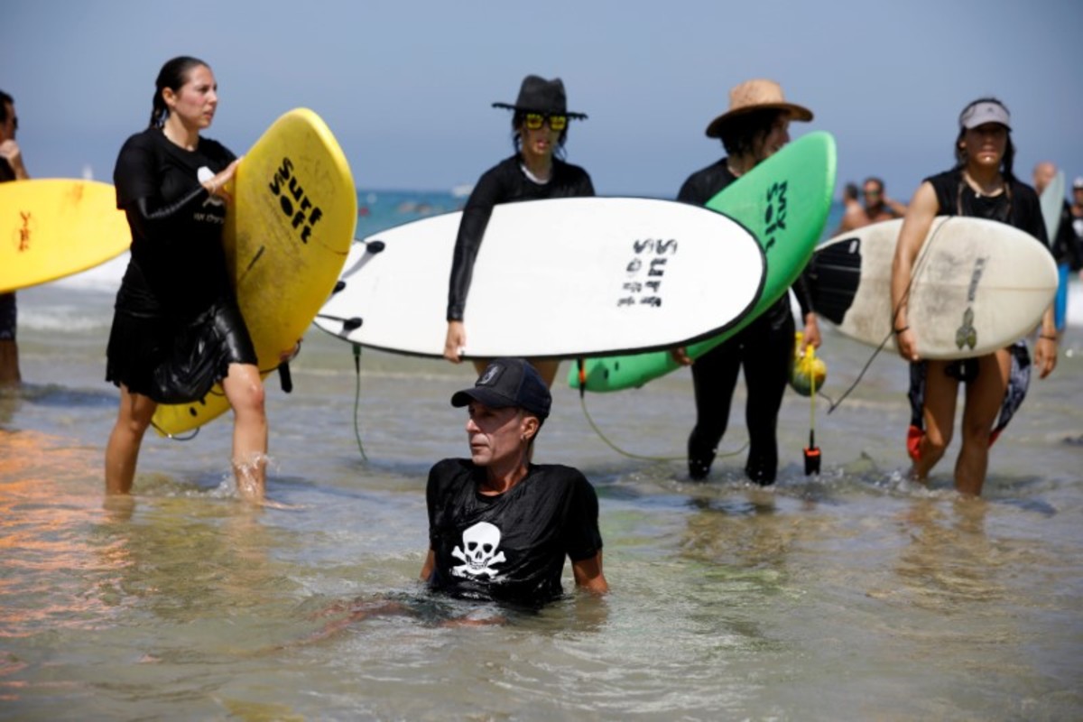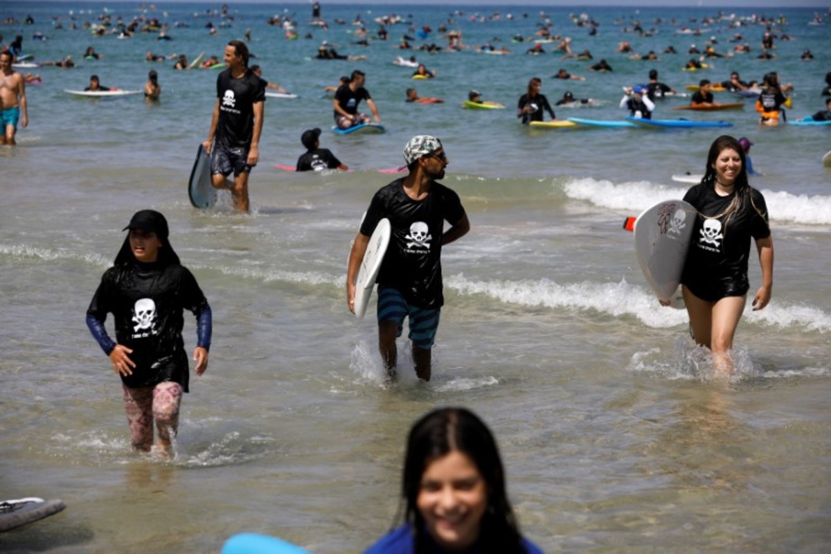 HERZLIYA, Israel (Reuters) - Hundreds of Israeli surfers in black skull-and-crossbones shirts took to the waves on Friday in what they said was a record-breaking protest against potential environmental damage from off-shore gas development.