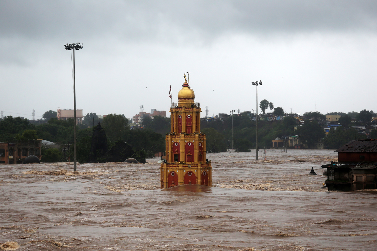 Houses and temples are seen submerged in the waters of overflowing river Godavari after heavy rainfall in Nashik, India, August 5, 2019. REUTERS/Francis Mascarenhas