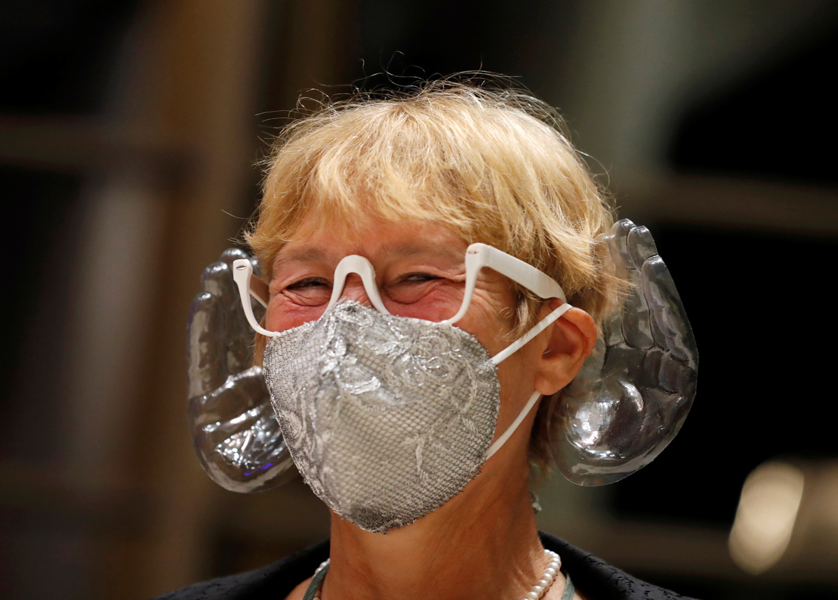 Fischer's music-enhancing face mask has two plastic cups shaped liked life-size palms attached to the mask's strings and designed to fit around the wearer's ears, allowing concertgoers in the age of coronavirus to enjoy improved acoustics.
