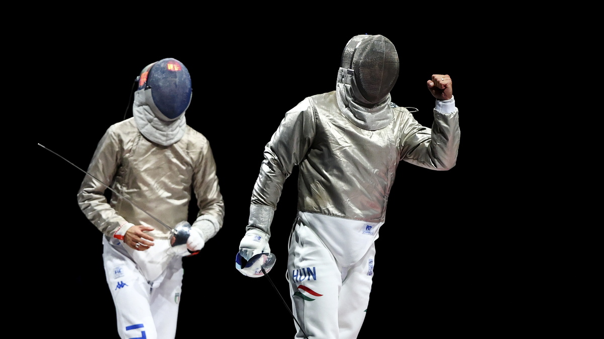 Tokyo 2020 Olympics - Fencing - Men's Individual Sabre - Gold medal match - Makuhari Messe Hall B - Chiba, Japan - July 24, 2021. Aron Szilagyi of Hungary reacts during the match as Luigi Samele of Italy looks on REUTERS/Maxim Shemetov