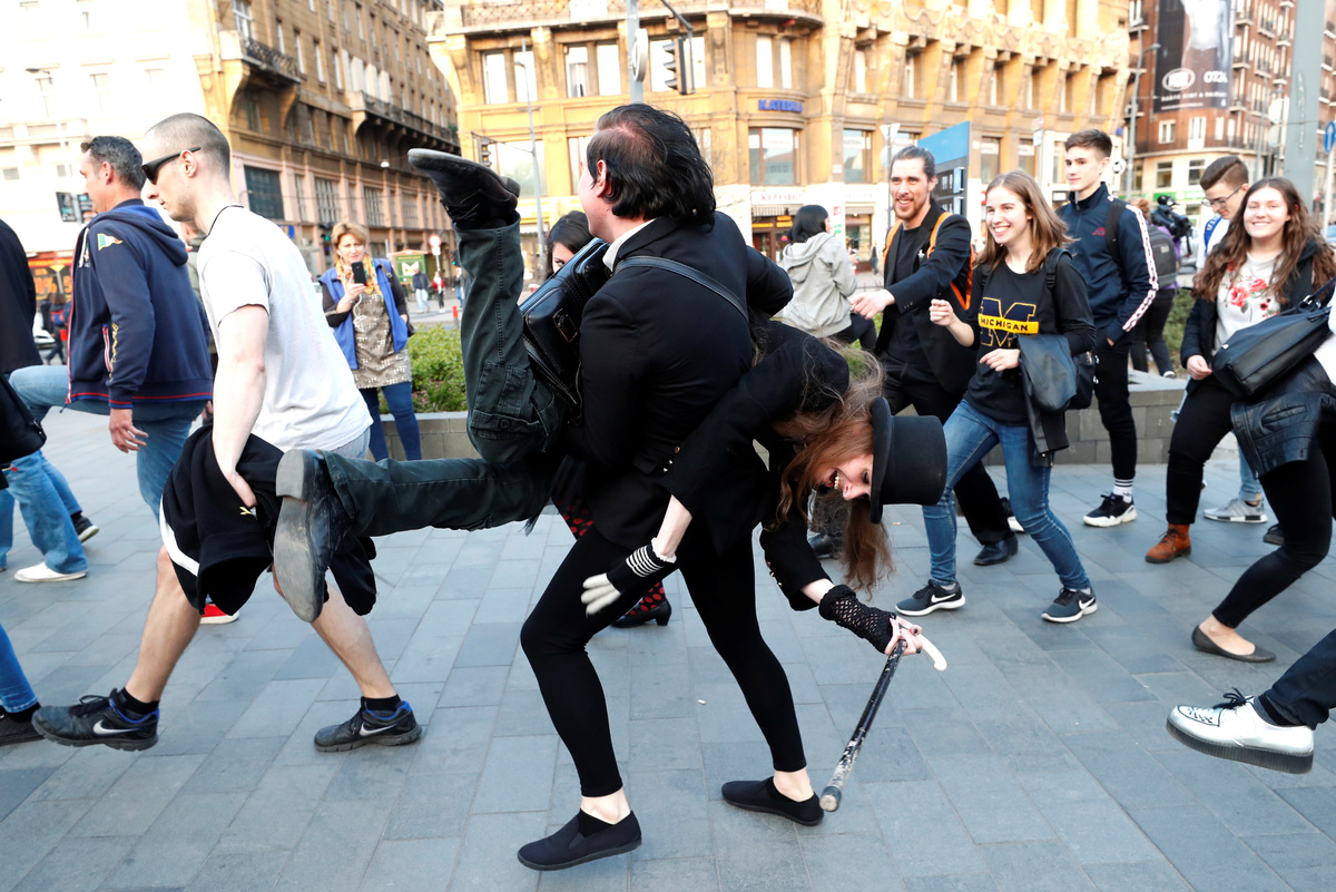 BUDAPEST (Reuters) - Hundreds of Hungarians marched through central Budapest in a "silly walk" parade on Monday, copying flamboyant moves from British comedy group Monty Python's famous television sketch to mark April Fools' Day.