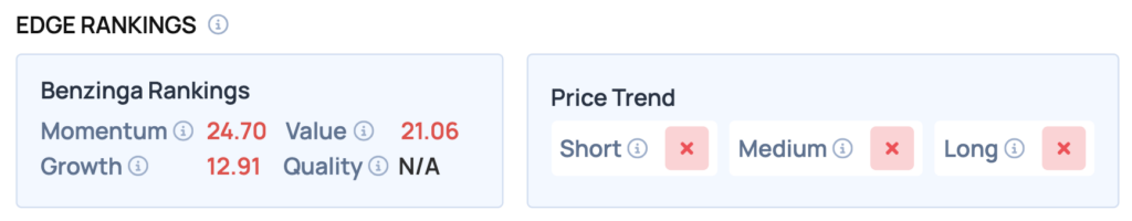 Benzinga Edge Rankings: Underscoring these fundamental challenges, Benzinga Edge rankings currently reflect the stock’s weakness with a Growth score of just 12.91 and a Value score of 21.06.