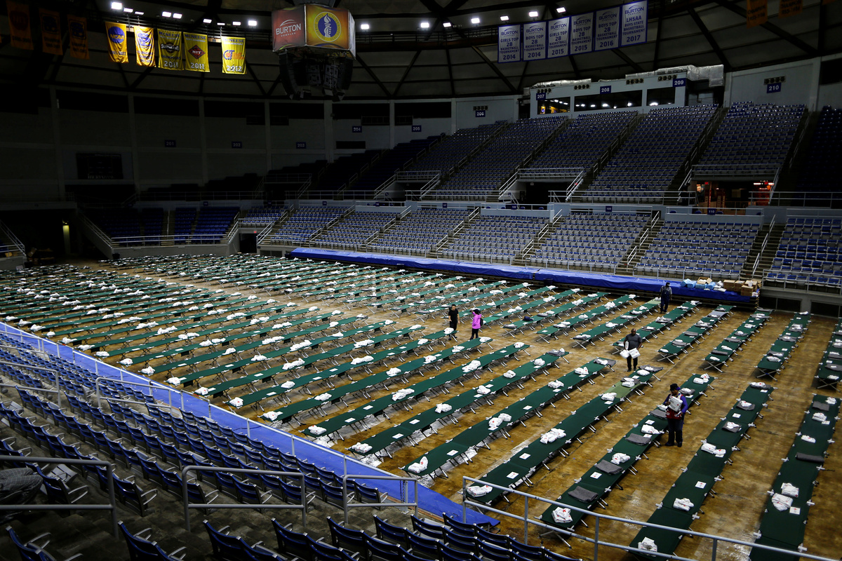 Even those who safely evacuated found further suffering as floodwaters inundated part of Port Arthur's Bob Bowers Civic Center, forcing evacuees into the bleachers.