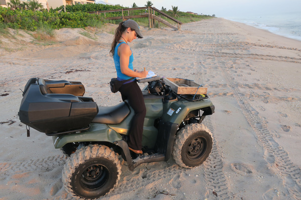 With the morning sun just above the horizon, Santulli stopped her ATV to consider a circuitous adventure by a green turtle on a beach about as wide as a neighborhood street.