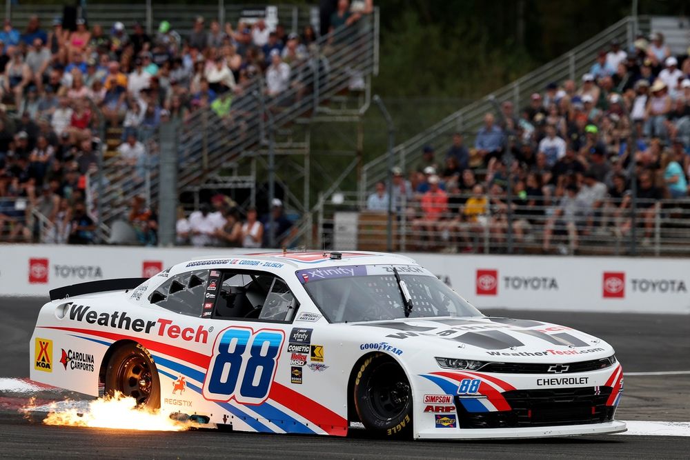 Hill passed Allgaier for second, but before Zilisch could collect the green-and-white checkered flag, Matt DiBenedetto stopped on track. He frantically climbed from the car, later revealing that there was a fire around his feet.